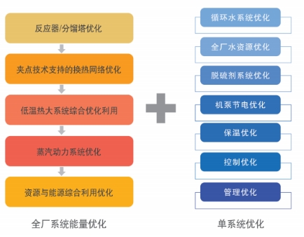 全厂系统能量优化技术是一套完整的技术体系,是以“三环节”理论为指导的产品架构。“V”是全厂系统能量优化的主要内容,其中包含的每个部分严格按照“三环节”理论要求的顺序开展工作,从源头入手,先优化装置,再优化系统。低温热大系统综合利用优化是指在全厂范围内回收余热,再在全厂范围内寻找热阱,按照温度对口梯级利用的原则进行匹配;蒸汽动力系统优化是在装置优化和低温热优化的基础上对蒸汽系统的新格局进行优化,包括蒸汽用户用汽等级优化,供汽压力优化以及压力能回收优化等;资源与能源综合利用优化是针对燃料气中的轻烃组分进行资源化利用,提高燃料气的附加值。“S”是根据用户的特殊需求所做的单项优化,这部分内容还在不断扩充中。